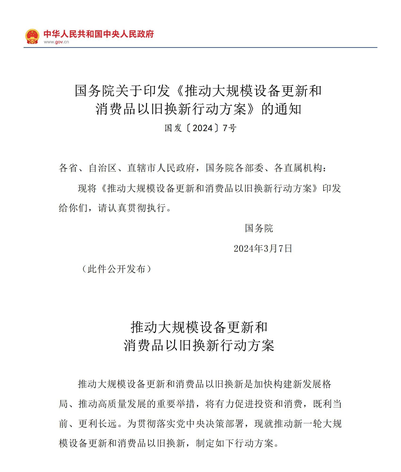 3月13日晚間,國務(wù)院正式印發(fā)《推動(dòng)大規(guī)模設(shè)備更新和消費(fèi)品以舊換新行動(dòng)方案》。