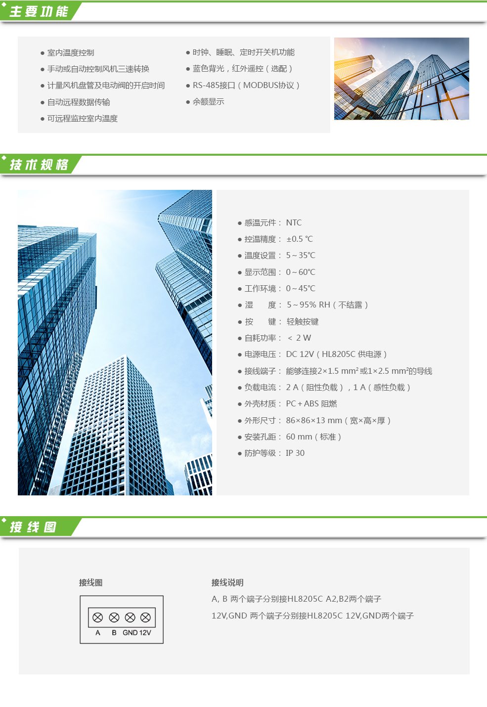 網絡型計時溫控器HL8205S適用于寫字樓、商業地產及家庭居室的溫度控制及對空調使用的計量計費。其具備普通溫控器調節室內溫度的功能,同時具有對風機盤管的三速運行時間、電動閥的開關時間進行計量,并自動遠程傳輸數據,也可通過集中控制遠程監控。