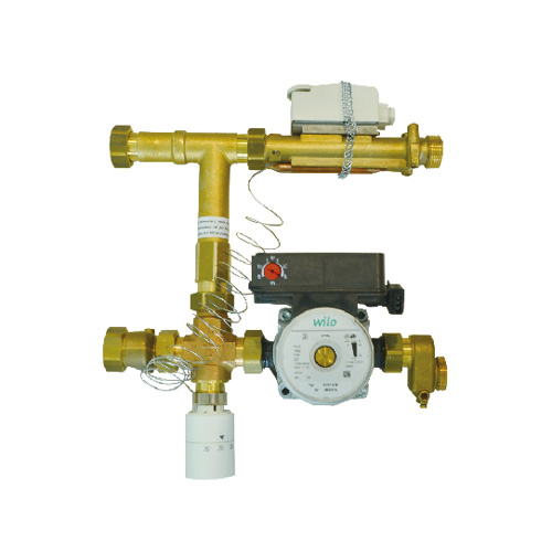 E2505型混水中心是將末端地暖高溫供水降低溫度。例如在改造項目中,采暖末端散熱器與地暖同時存在,熱源供水溫度較高的系統中,將高溫供水與低溫回水混合,通過傳感器與溫控閥調節混合比例,達到降低供水溫度目的。